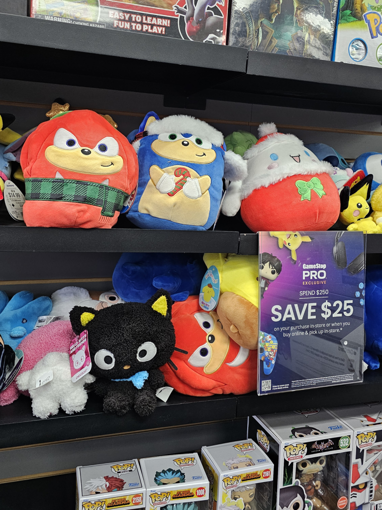 Sitting on a shelf among other plushes at Gamestop in mid-November 2025.